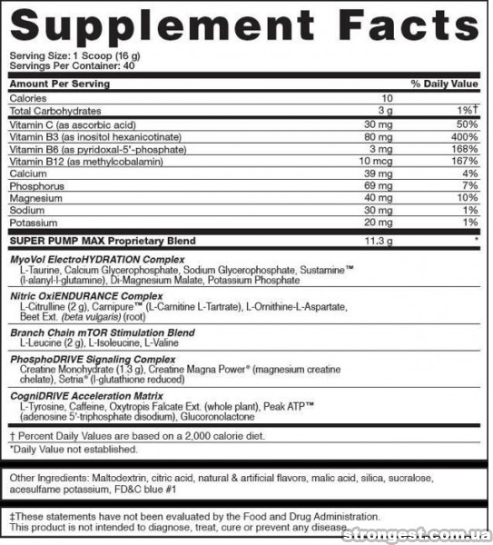 SuperPump Max – насправді еталонний передтренувальний комплекс. Якщо ви хоча б раз відчули дію SuperPump Max, то більше не зможете використовувати інші препарати. Клінічні випробування показали 40% збільшення росту м'язової маси при використанні SuperPump Max. Але цей продукт дозволяє не тільки набирати м'язову масу, але й утилізувати жирову тканину для отримання енергії, необхідної при високоінтенсивних тренуваннях. При цьому SuperPump Max зберігає м'язову тканину від руйнувань під час важкої фізичної роботи.