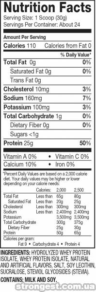 У складі iso-100 ви зустрінете тільки ті речовини, які необхідні для того щоб виростити суху м'язову масу. Його без побоювання можуть застосовувати атлети, які відзначають за собою схильність до набору зайвої ваги. Тут не присутній і слід лактози, тому людям з нездатністю до засвоєння молочного цукру нема чого боятися.