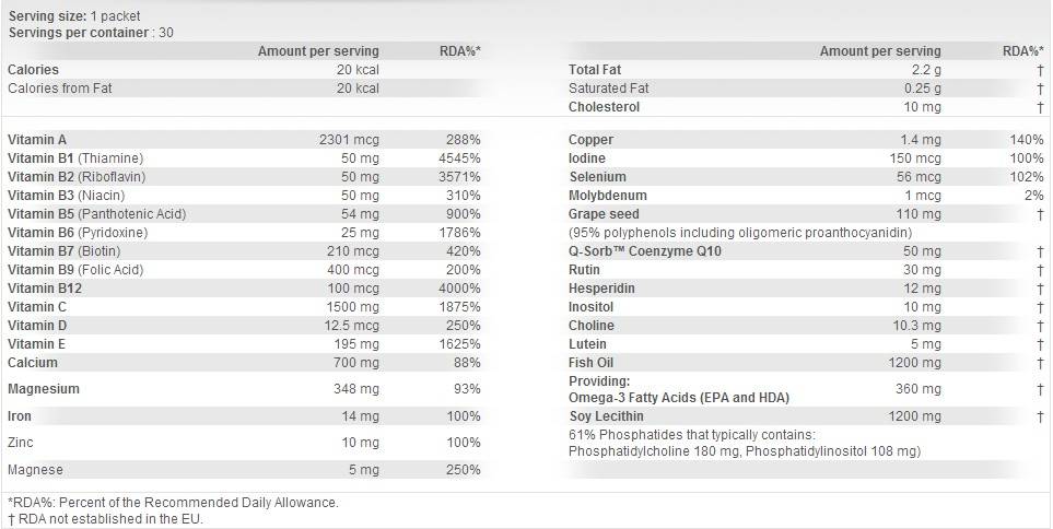 Спеціально адаптована формула відрізняється від аналогічних продуктів своїм прицілом на організм атлета. У ній присутній розширений зміст вітаміну С, вітаминів групи В, а також таких мінералів, як селен, цинк та магній.